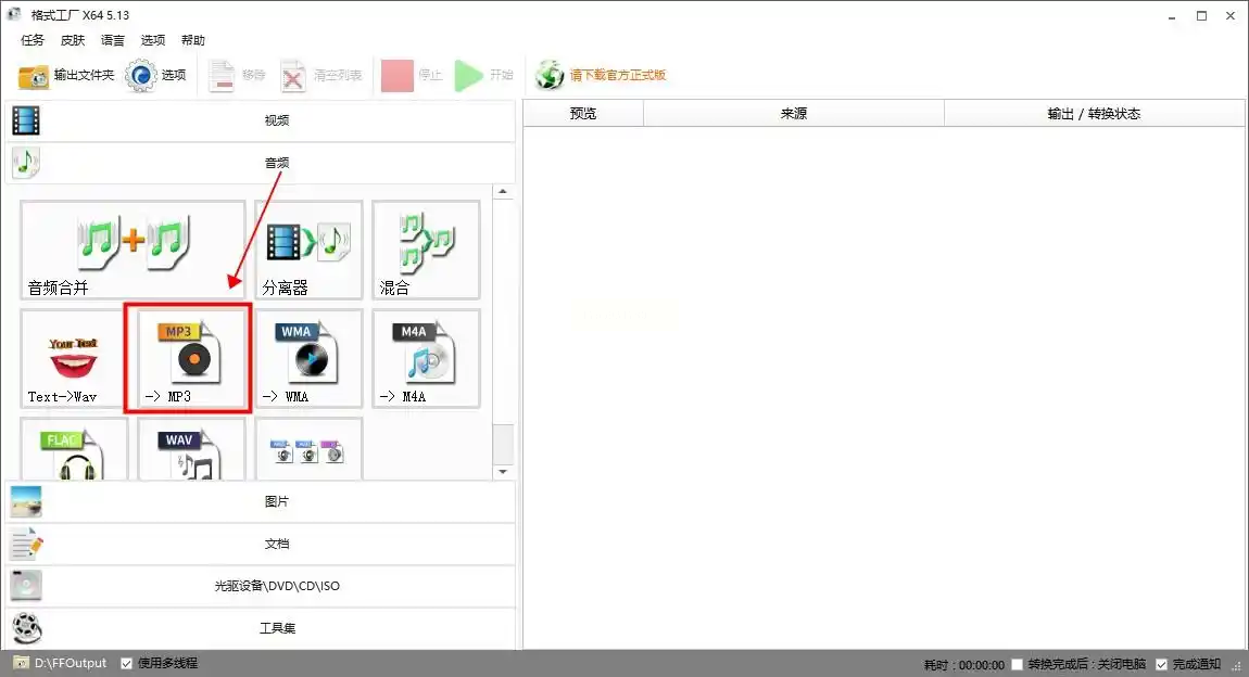 步骤一:下载并启动格式工厂,在主界面选择"音频"栏,点击【→MP3】功能设置输出格式。