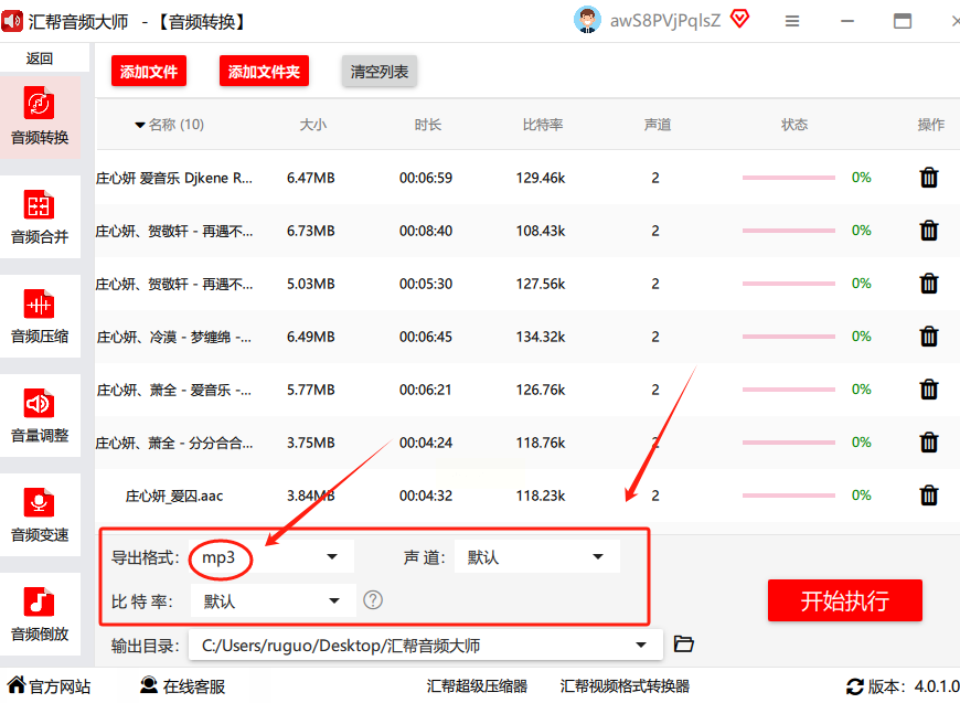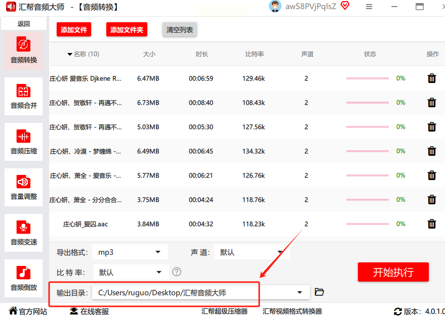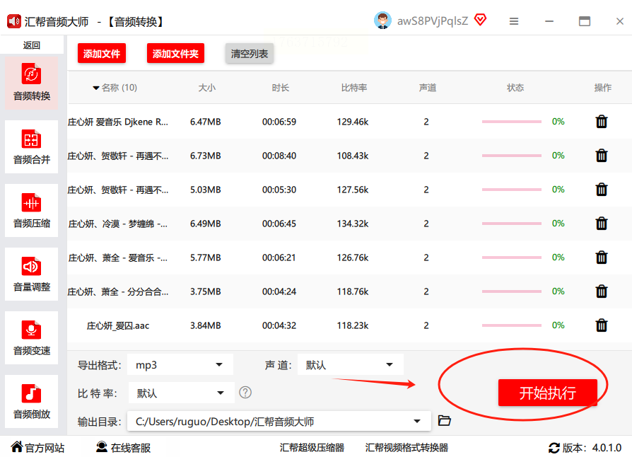 6. 开始转换:确认所有设置都正确无误后,点击右下角那个醒目的红色【开始执行】按钮。软件会立即开始转换过程,你可以在界面上看到转换进度条,了解当前的转换状态。转换完成后,系统会自动打开你指定的输出目录,这时你就能找到已经转换好的MP3文件了。