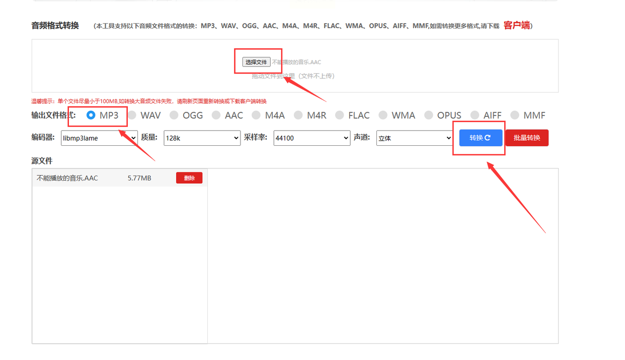 3. 上传AAC文件:点击“选择文件”按钮,从你的电脑中选择需要转换的AAC文件。有些平台支持拖放操作,你也可以直接将文件拖拽到指定区域。