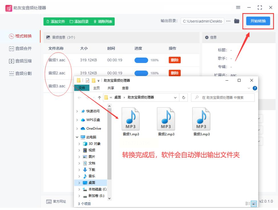 5. 开始转换:确认所有设置都正确后,点击界面上的【转换】按钮。软件会开始处理文件,你可以在界面上看到每个文件的转换进度。转换完成后,你可以直接在指定的文件夹中找到转换好的MP3文件。