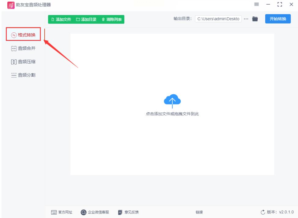 1. 打开软件:在电脑上找到并打开已经安装好的“助友宝音频处理器”。启动后,你会看到左侧有一个功能列表,最上面的就是【格式转换】选项,点击它进入转换界面。
