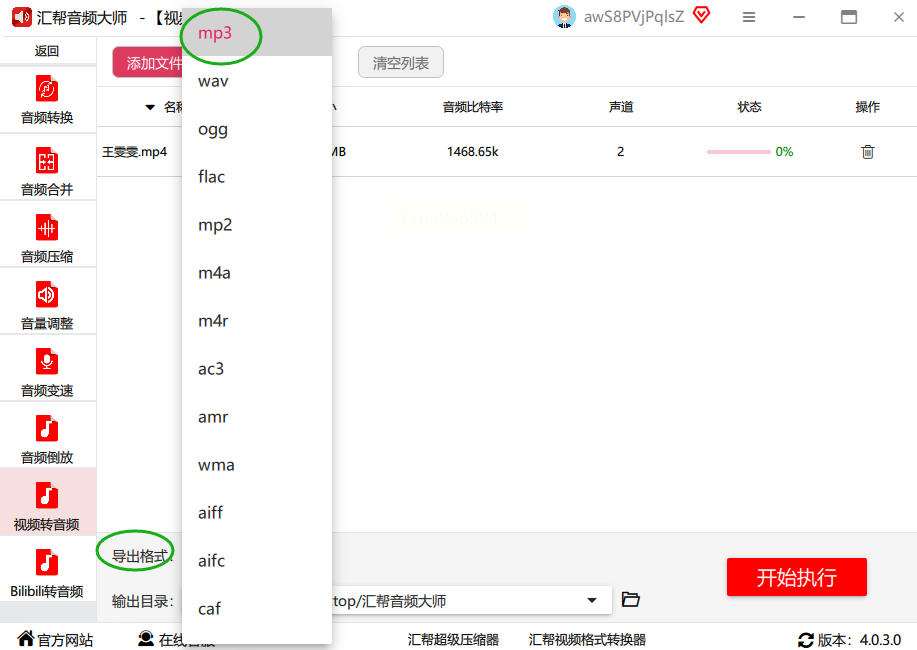 视频文件导入完成后,请先选择想要的【导出格式】,建议大家选择mp3格式。