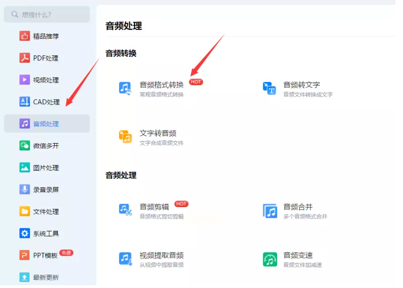 1. 打开软件 → 左侧选"音频处理" → 右侧点"音频格式转换"