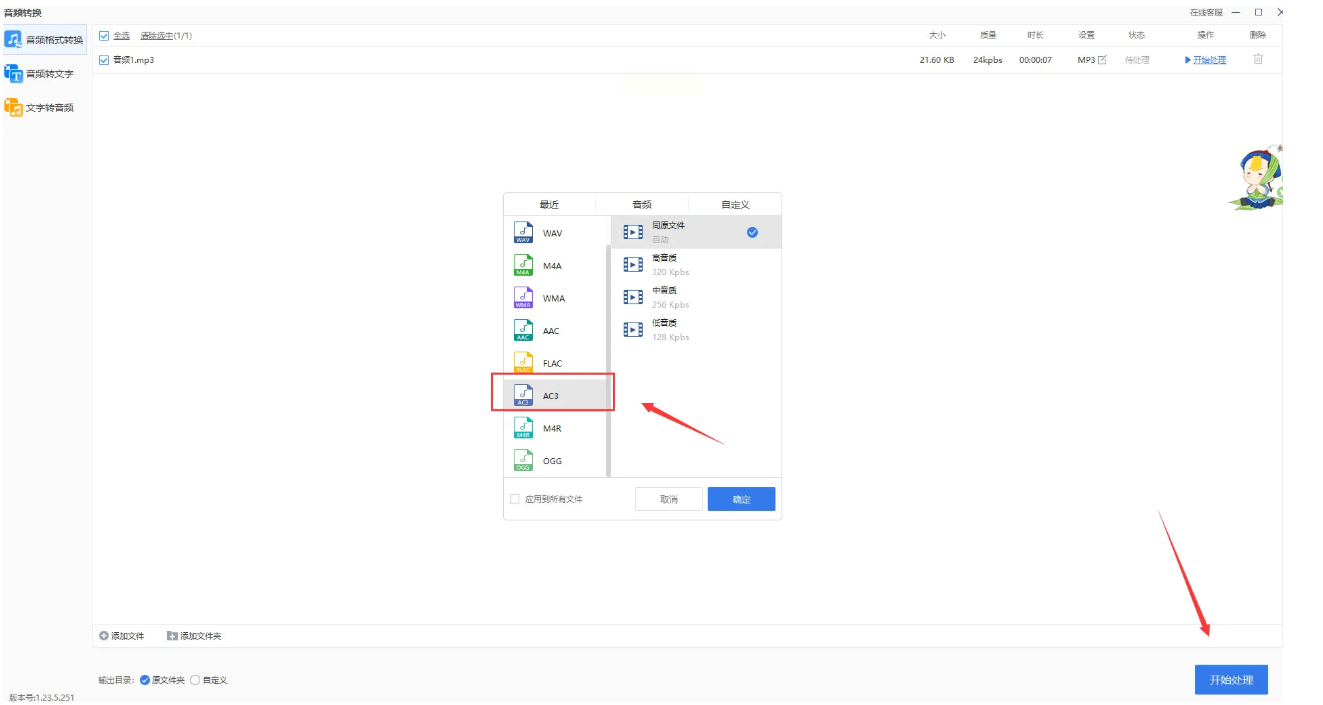 2. 添加文件(支持Ctrl多选)→ 输出格式选"AC3"