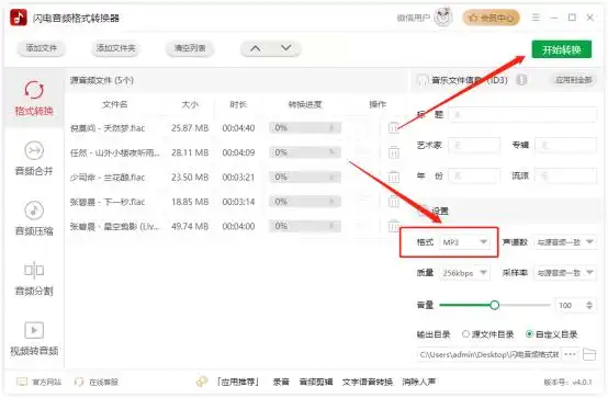 3. 选MP3格式:在格式列表选 MP3,设置输出路径(默认在原文件同目录)