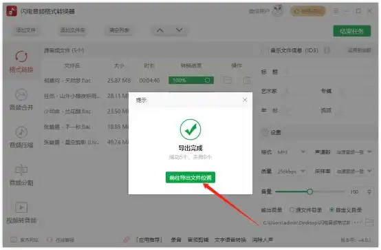 6. 开始转换:点「开始执行」,进度条走完后会自动弹文件夹,检查文件大小和音质