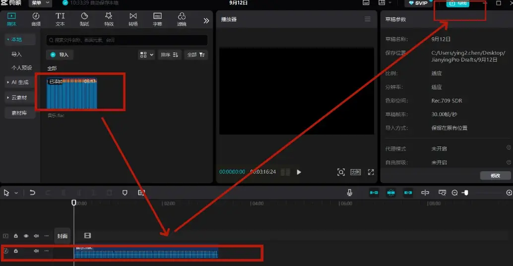 3. 拖到轨道:把音频拖到时间轴,点右上角「导出」