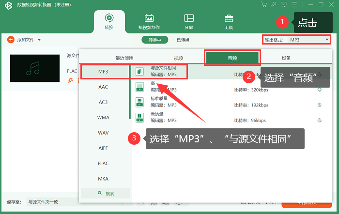3. 选输出格式:在「音频格式」列表里选 MP3,可自定义比特率/声道