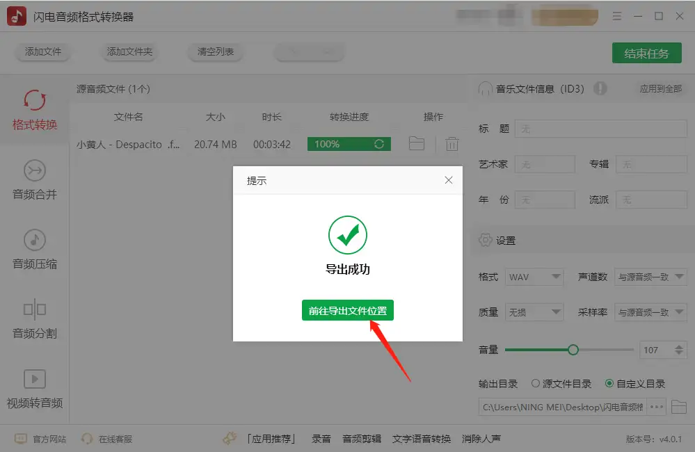 转换完成后,软件会有提示。你可以直接点击“打开输出文件夹”快速定位到生成的WAV文件,建议随机播放一段,检查音频是否完整、有无异常噪音,确保转换成功。