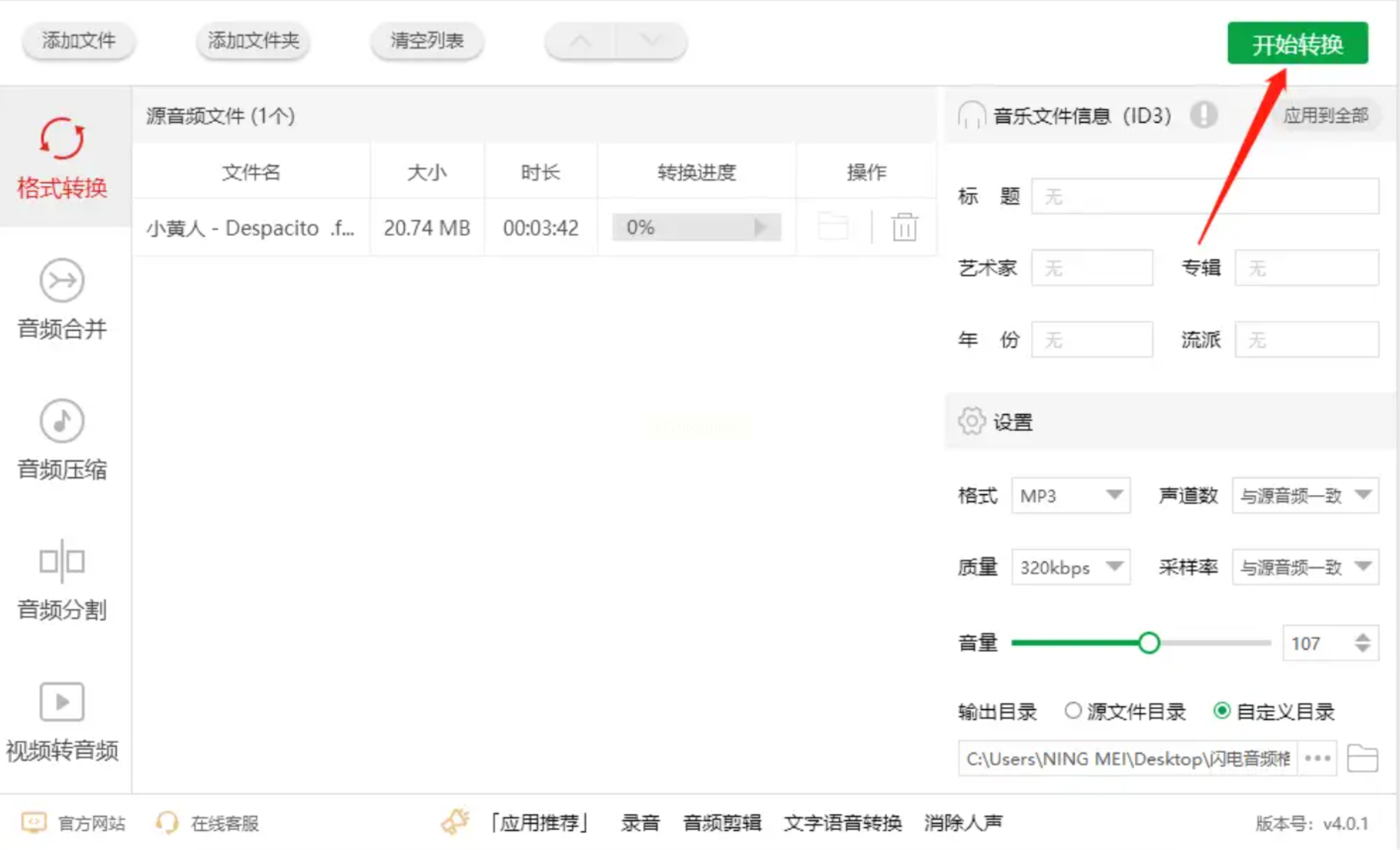 确认输出目录(即转换后文件的保存位置)后,点击【开始转换】或【全部转换】按钮。转换过程通常很快,一个几百兆的FLAC文件可能在几秒到一分钟内完成。
