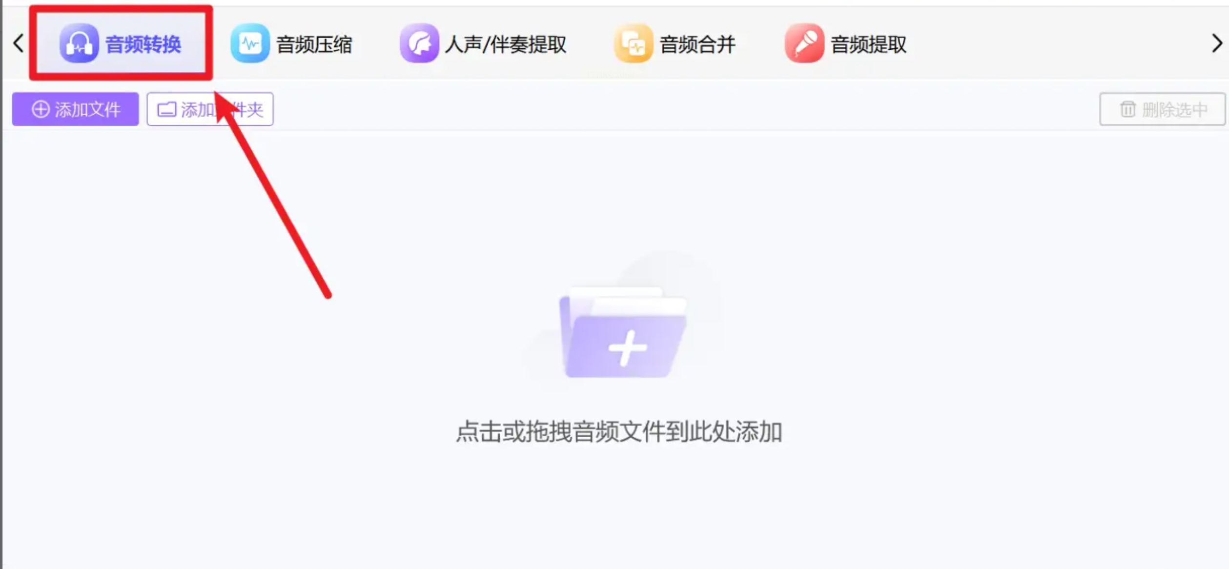 打开工具,在主界面中找到并点击【音频转换】功能模块。它通常支持几乎所有常见音频格式的互转。