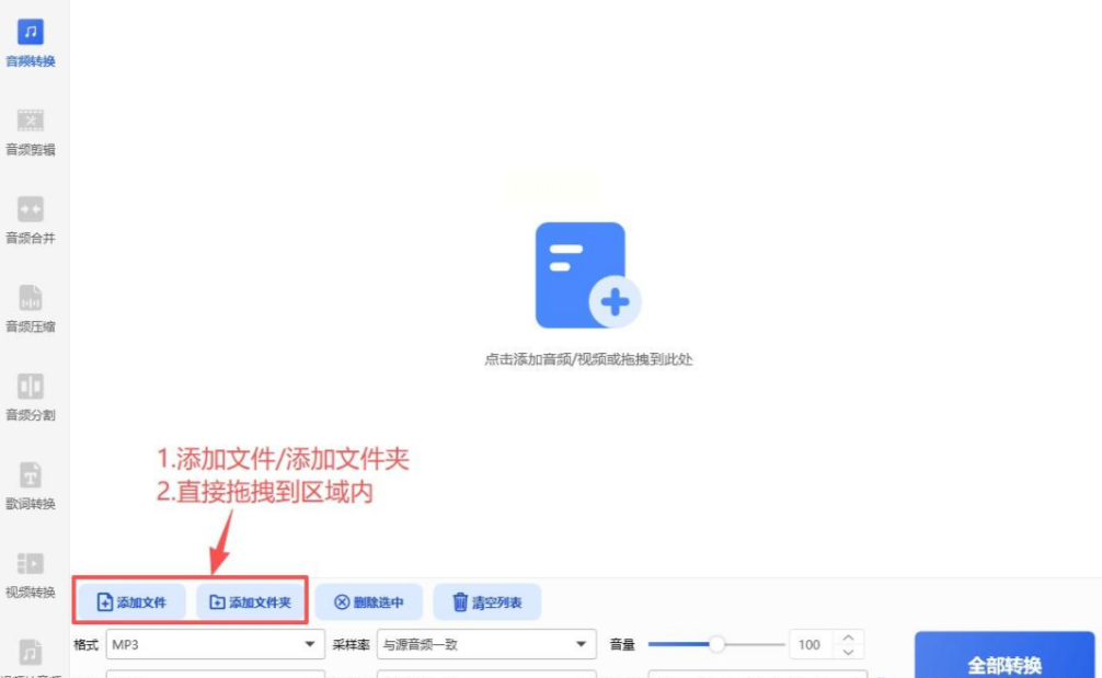 2. 进入音频转换模块:在主界面左侧功能栏找到“音频转换”选项(或类似“格式转换”“音频处理”的功能区),点击进入后界面会显示“添加文件”“添加文件夹”等批量操作入口。