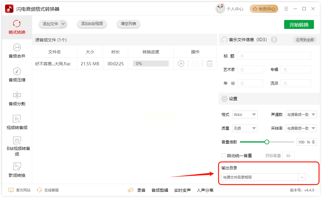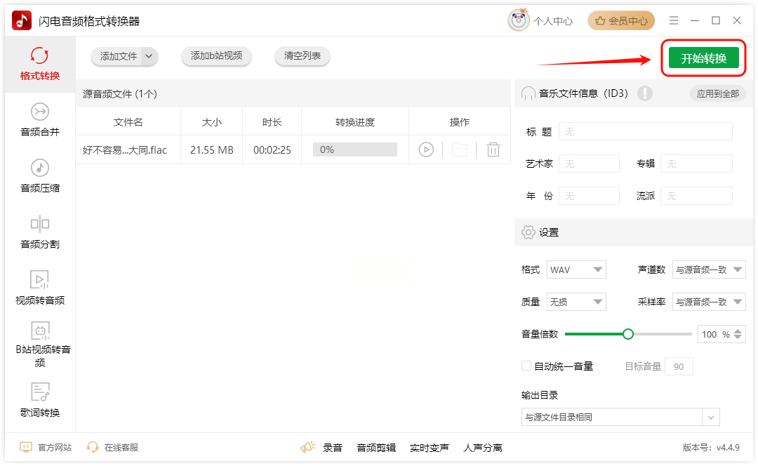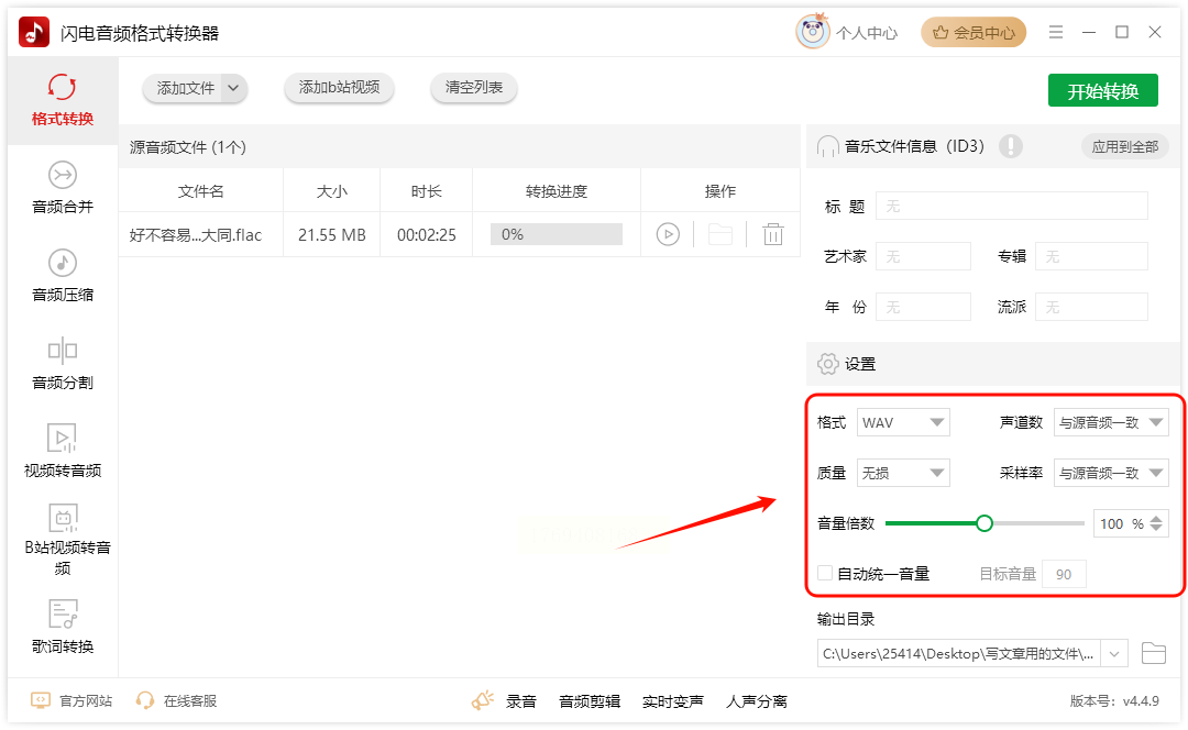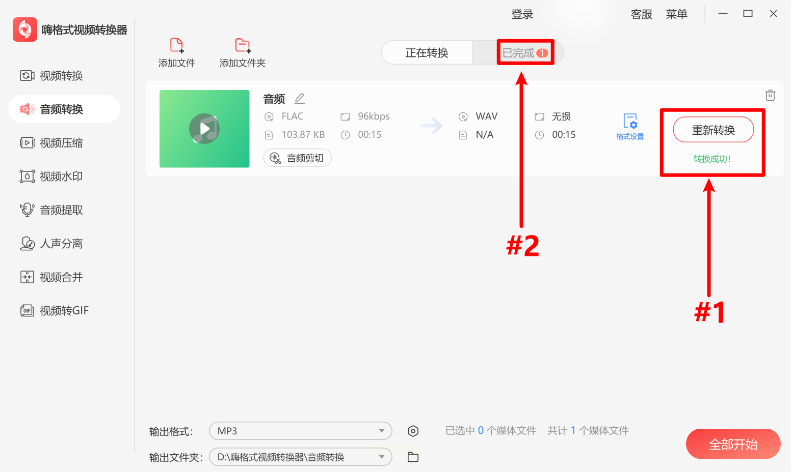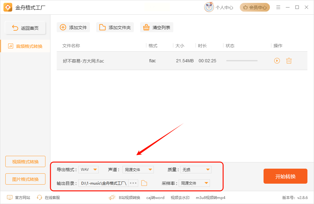 - 步骤1:打开软件后,在左侧“音频转换”分类中点击“添加文件”,支持从资源管理器直接拖拽FLAC文件。
