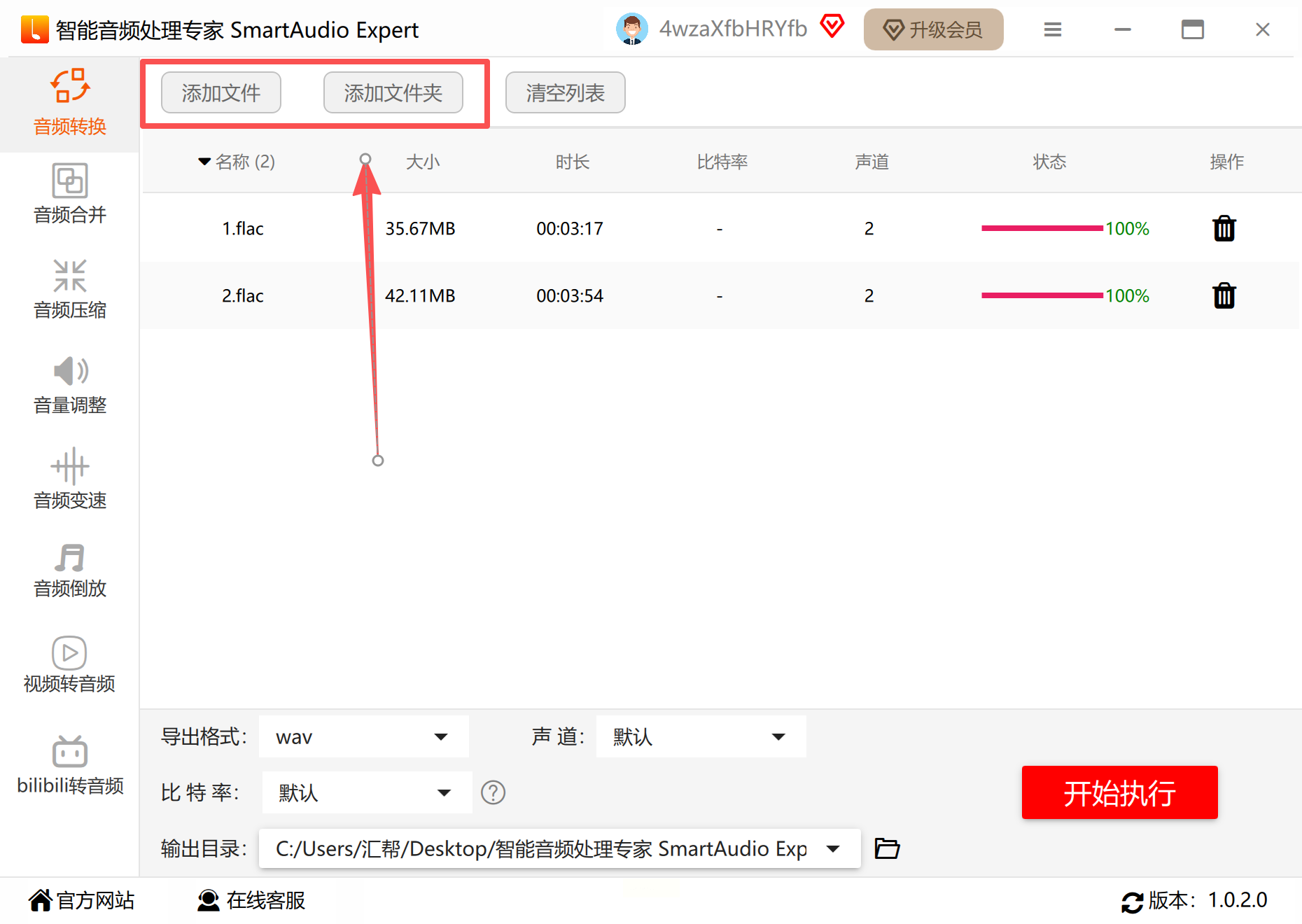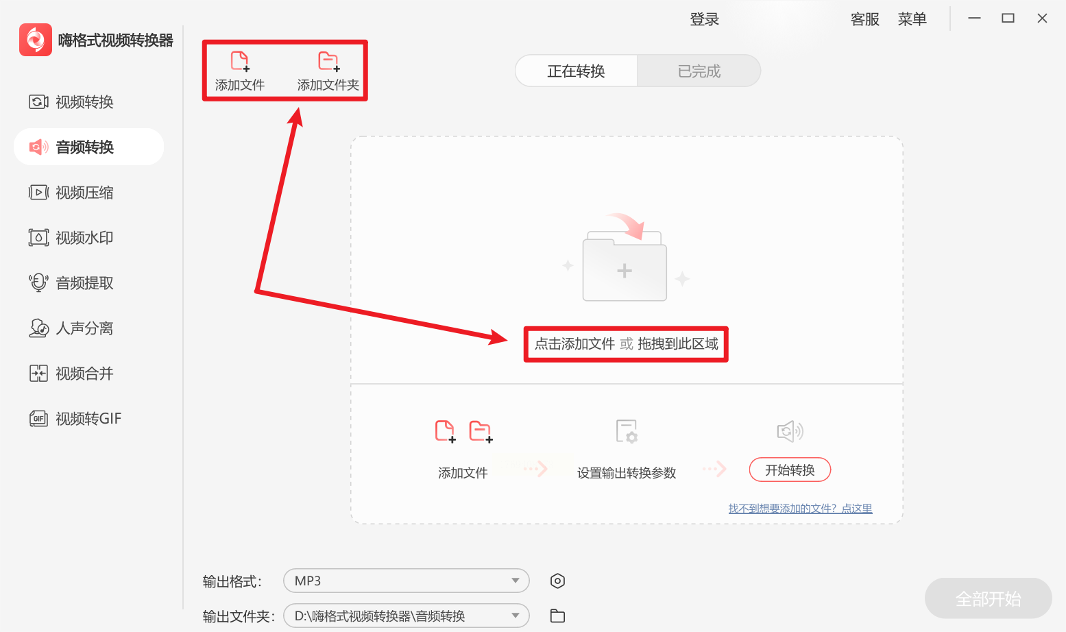 - 步骤1:进入“音频转换”模块,点击“添加文件”或“文件夹”批量导入。