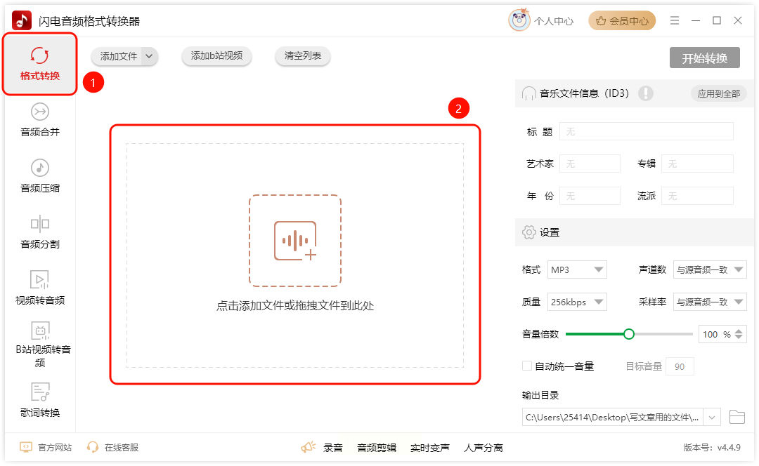 - 步骤1:启动软件后,在功能区选择“音频转换”,界面分为“输入文件”“输出设置”“进度显示”三栏,逻辑清晰。