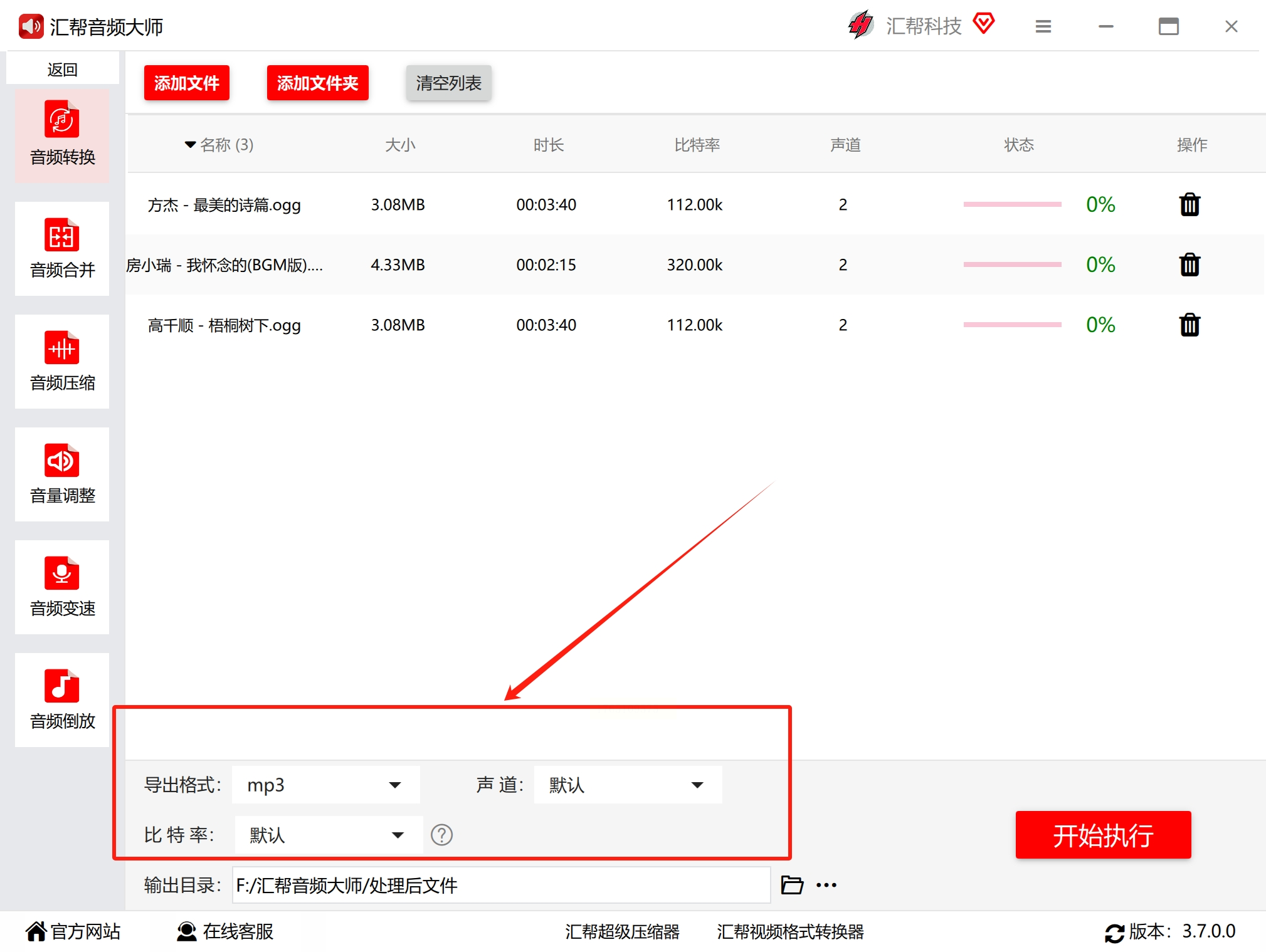 3. 文件添加完成后,在输出设置区域选择目标格式为“MP3”。软件通常会提供参数选项,例如声道、编码质量等,若您没有特殊要求,使用默认配置即可。