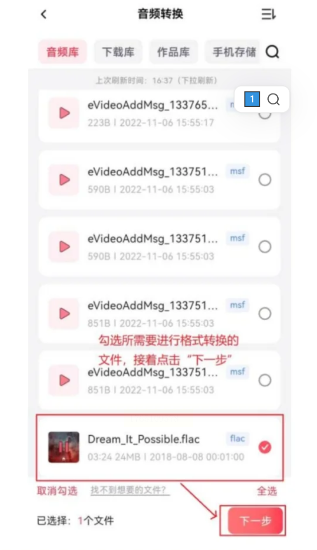 2. 在文件选择界面,APP通常会请求访问存储权限。授予权限后,您可以浏览手机内的音频文件,选中需要转换的OGG文件。应用支持多选,可一次性添加多个文件进行批量转换。