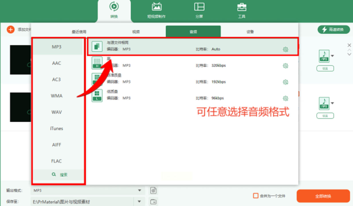 2. 成功导入文件后,在界面右侧或下方找到“输出格式”设置选项。点击下拉菜单,在音频格式列表中选择“MP3”。通常软件会提供多种音质参数(如比特率、采样率)供调节,您可以根据需要调整,若不确定可保持默认设置。