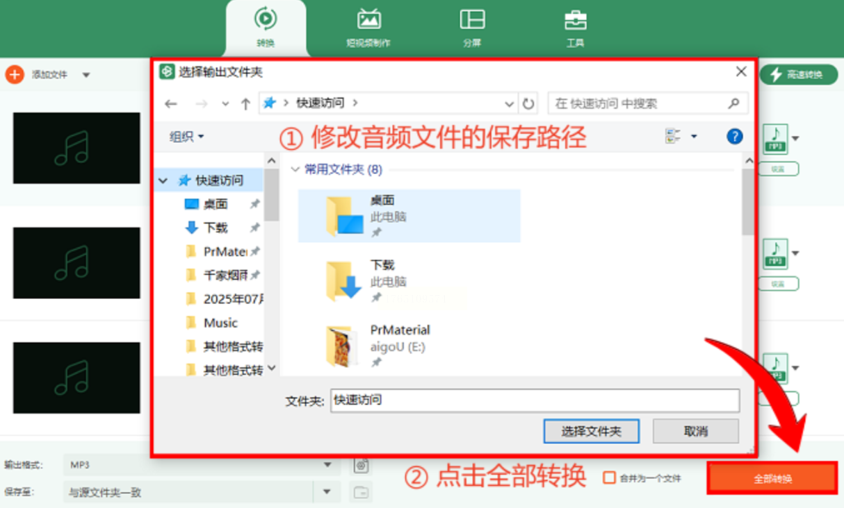 4. 设置输出文件夹位置,确认后点击“开始转换”。转换过程通常较快,完成后您可以在指定路径中找到MP3文件,并使用播放器进行试听验证。