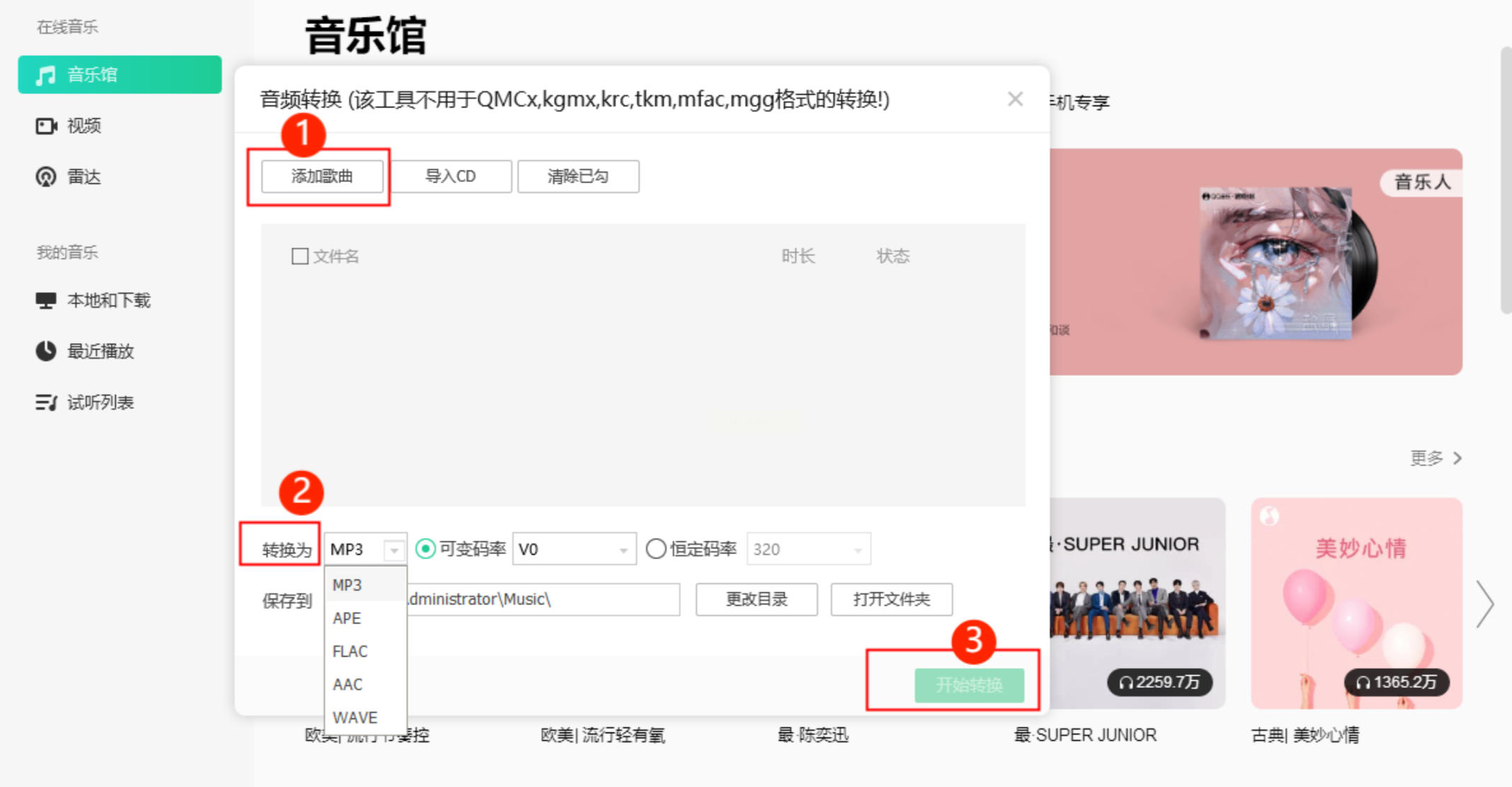 1. 打开电脑版音乐播放器,在界面右上方找到菜单栏或工具箱图标,点击后选择“音频转码”功能。该功能通常位于“工具”或“更多服务”分类下。