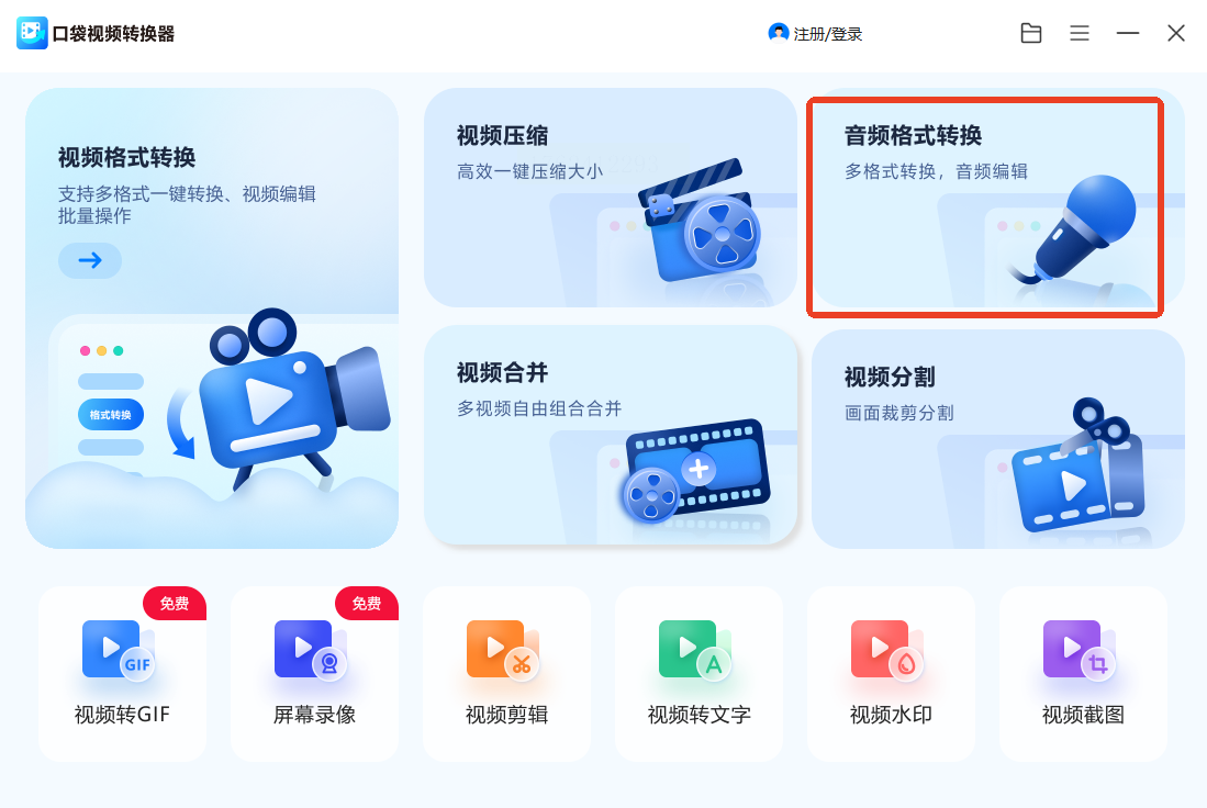 这款软件主打视频处理,但也包含音频转换功能。打开“音频格式转换”,上传APE文件,设置输出为MP3,支持批量或个性化转换,点击开始即可完成。