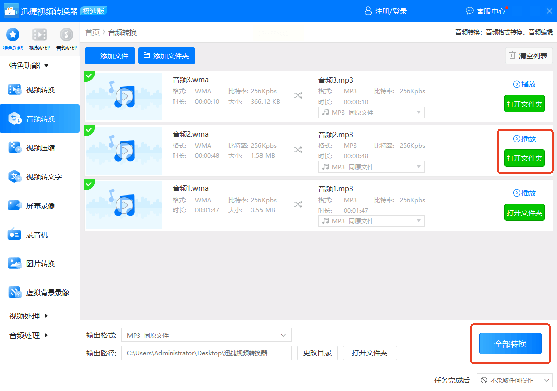 步骤四:确认输出目录,点击“全部转换”按钮,等待处理完成即可在指定文件夹查看MP3文件。