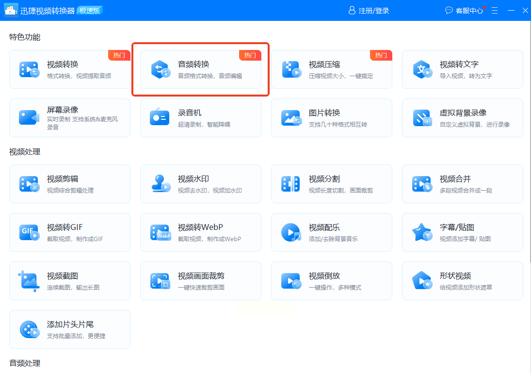 步骤一:启动软件后,在主界面找到并点击“音频转换”模块。