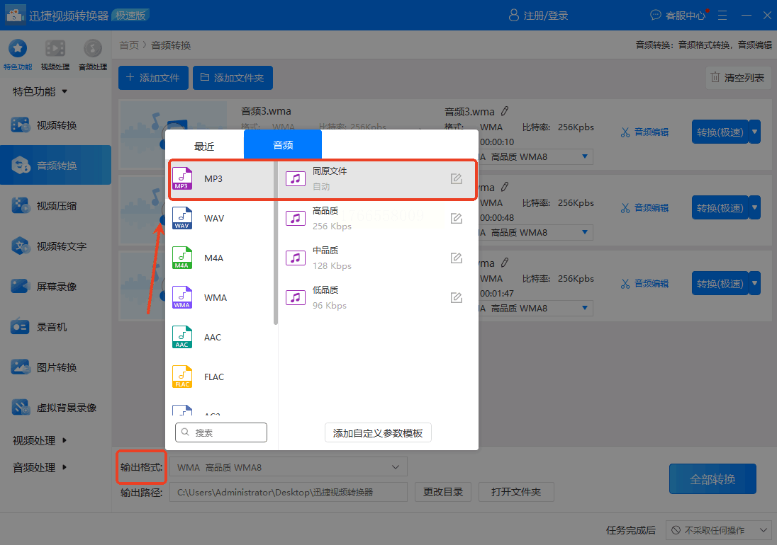 步骤三:在格式选项中选定MP3,软件还提供WAV、AAC等其他常见格式备选。