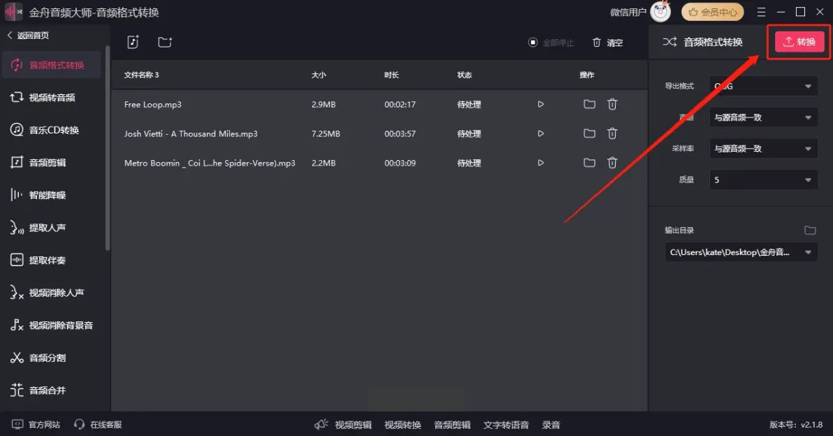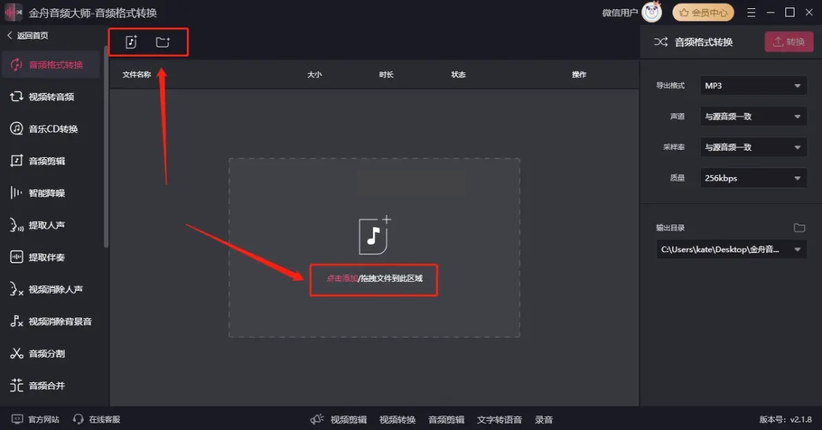 启动金舟音频大师后,首页“热门功能”区域清晰展示【音频格式转换】选项。点击该选项进入转换界面,此时界面分为左右两栏:左侧为文件列表区,右侧为参数设置区,布局符合专业软件的操作逻辑。