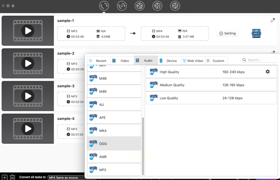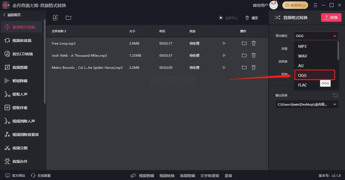 在右侧参数面板中,点击“输出格式”下拉菜单,选择【Audio】>【OGG】,此时下方会出现OGG格式的详细参数设置。可选择预设质量(低/中/高)或自定义参数(如比特率、声道、采样率)。特别值得注意的是,软件提供“高保真”和“压缩优先”两种转换模式,分别对应音质优先和体积优先的不同需求。