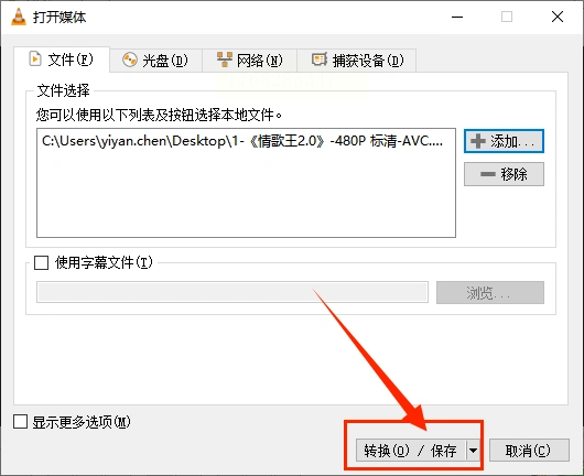 步骤2:在弹出窗口点击"添加",选择B站视频文件,再点击"转换/保存"。