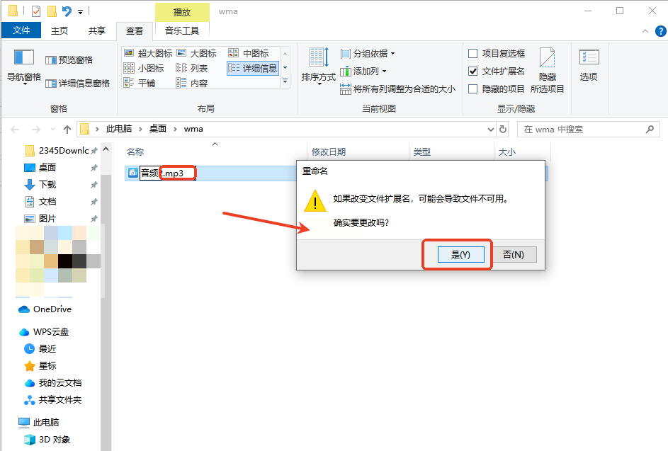 步骤二:右键点击目标WMA文件,选择“重命名”,或将光标选中文件名后按F2键,将后缀“.wma”直接改为“.mp3”,系统会弹出提示,确认更改。