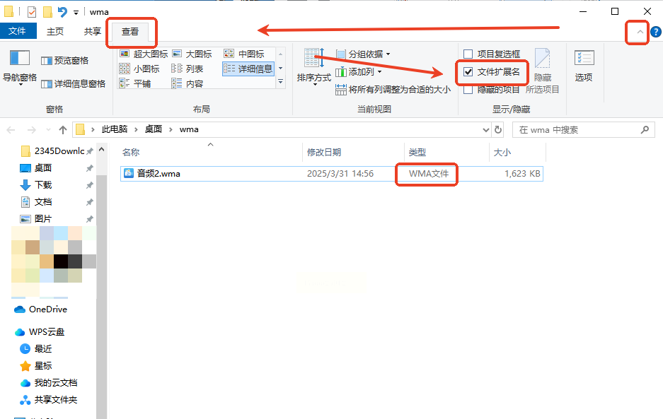 步骤一:在文件资源管理器中,打开包含WMA文件的文件夹,在“查看”菜单中勾选“文件扩展名”选项,使文件的全名可见。