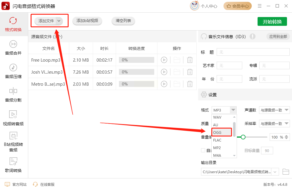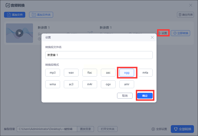 3. 参数设置:点击界面右侧"设置"按钮,在弹出窗口中选择"输出格式→音频→OGG",可额外调整声道(建议保留立体声)、采样率(44.1kHz为通用标准)等参数。