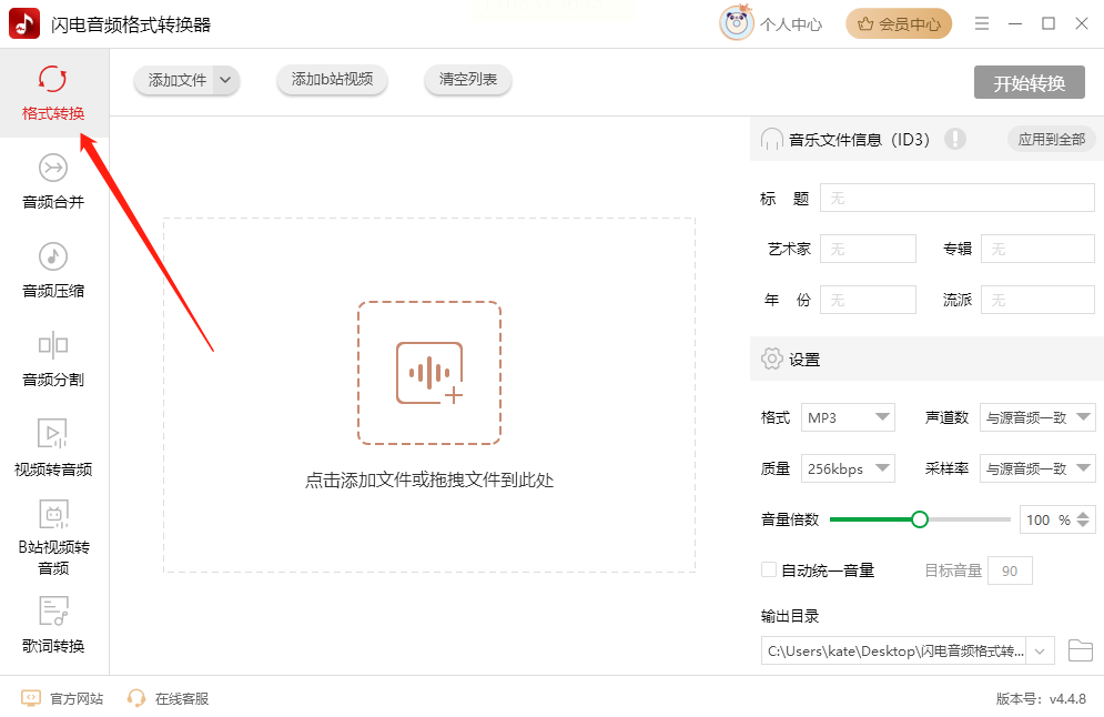 1. 功能入口:在软件首页的"热门工具"栏找到"音频格式转换",进入后界面分为左右两栏,左侧为文件列表,右侧为参数设置区。