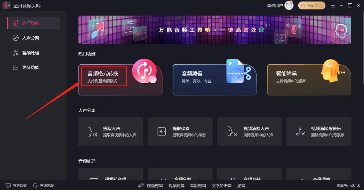 1. 功能入口:在软件首页的"多功能工具箱"中找到"音频转换"选项,点击进入后自动加载音频处理界面。