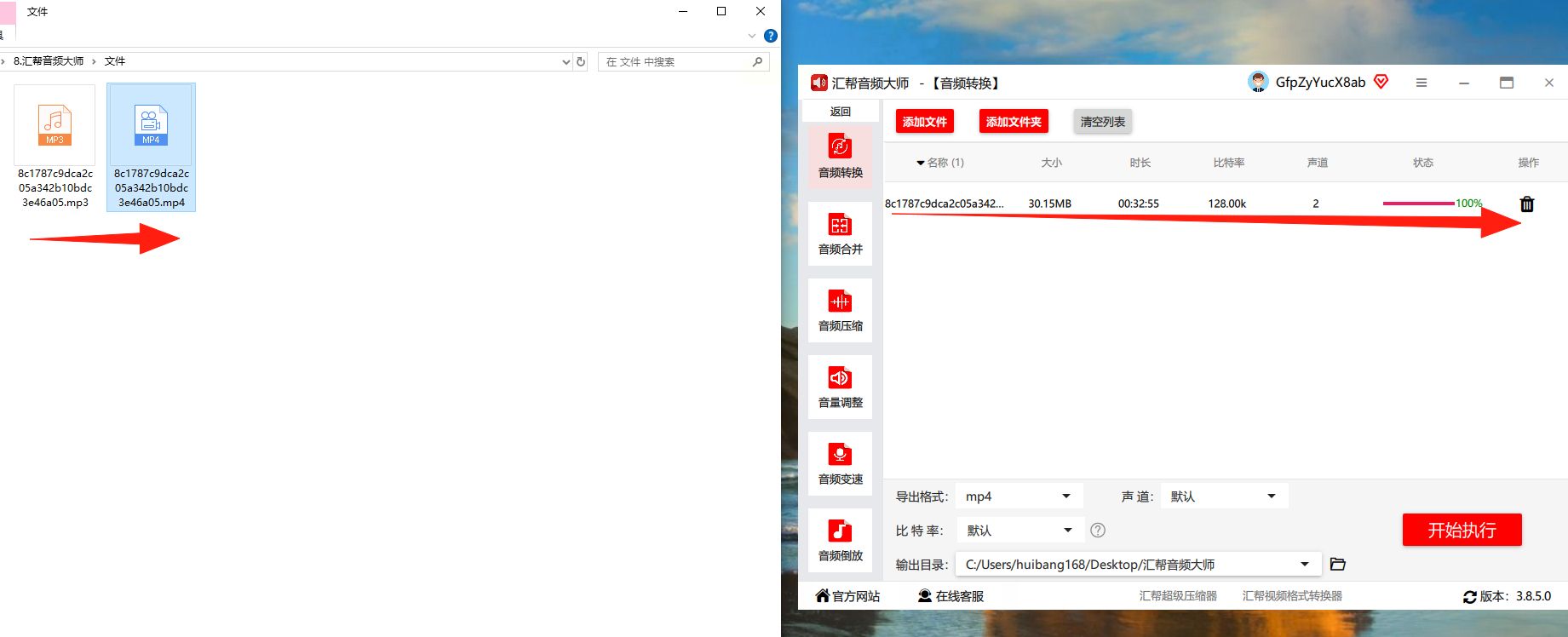 步骤三:成功导入文件后,文件列表会显示在界面中。此时,你可以在下方设置输出格式,选择MP4。你还可以调整比特率等参数,比特率越高,通常音质保真度越好,但生成的文件体积也会相应增大。接着,设置好文件的输出目录,也就是文件转换后的保存位置。默认路径一般是系统桌面。