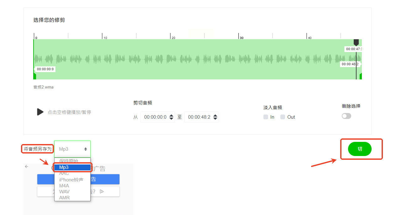 步骤三:在格式列表中找到“MP3”,然后点击确认转换的按钮(如【切】),网站就会开始处理了。