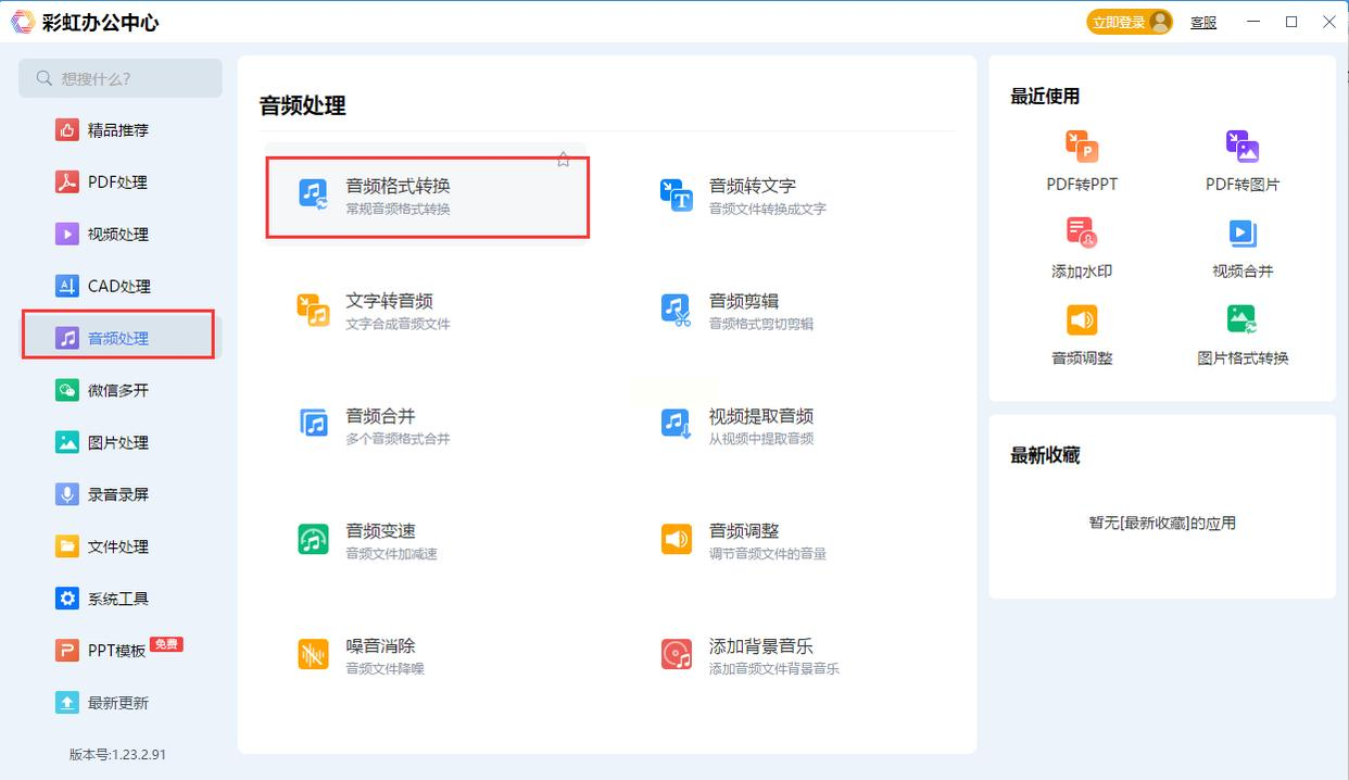 步骤一:打开彩虹办公中心软件,在主界面找到‘音频处理’并进入,然后点击‘音频格式转换’。