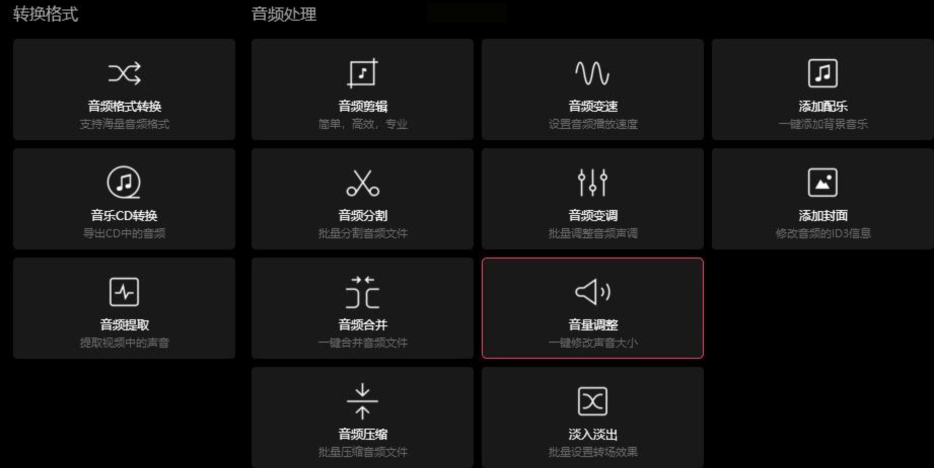 步骤一:打开软件,在主菜单中找到“音频处理”大类并点击。在随之展开的详细功能列表中,向下滚动找到“音频调整”或“音量修改”选项。