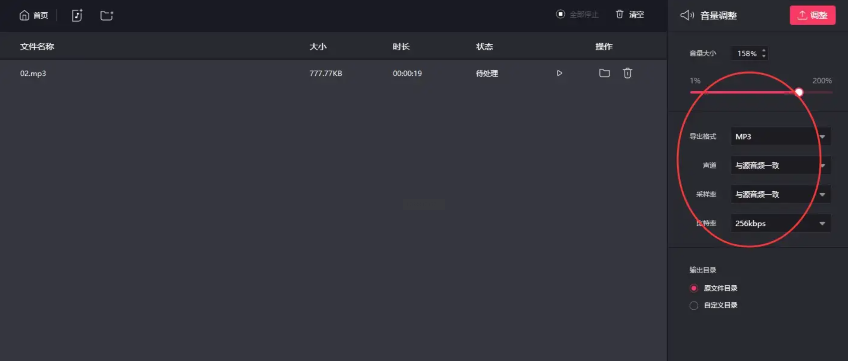 步骤三:界面右侧会有一个显眼的音量调节滑块。向右拖动滑块即可提升音量,软件通常会明确显示放大百分比(例如最高200%)。下方还可以根据需要设置输出音频的格式、声道等参数,如果不太了解,保持默认设置通常也能获得不错的效果。