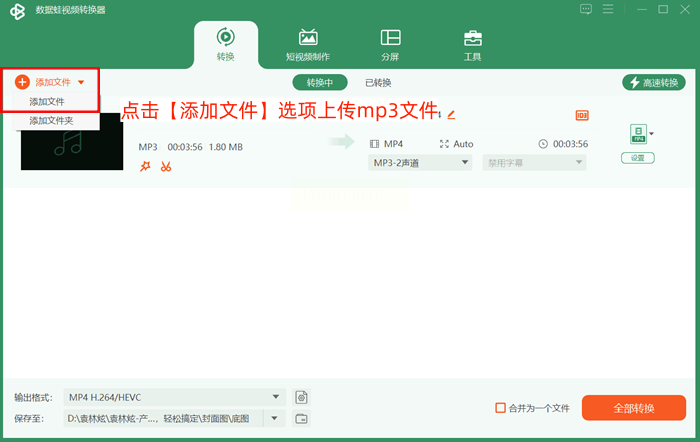 打开软件后进入格式转换界面,点击“添加文件”上传MP3。然后在输出格式中选择MP4,点击“高速转换”选项,一般提供倍速转换模式,最后执行全部转换即可。