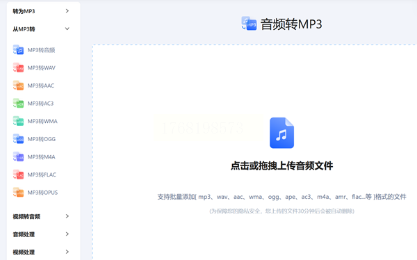 点击主界面的“音频转换”选项,进入格式转换专区。这里支持批量处理,你可以直接拖拽多个MP3文件到上传区域,或点击“添加文件”按钮逐个导入。