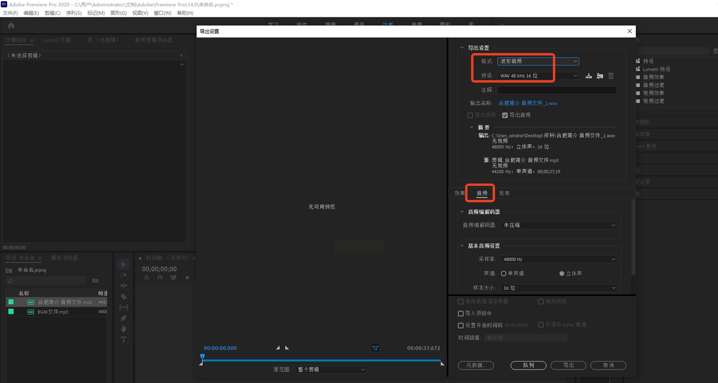 选中音频文件后,按快捷键`Ctrl+M`(Windows)或`Command+M`(Mac)打开导出窗口。在“格式”下拉菜单中选择“Waveform Audio (*.wav)”,根据需求调整声道、采样率(如44.1kHz)等参数。