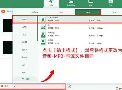 在输出格式里选择“音频”-“MP3”,质量选项建议选择“与源文件相同”,这样能最大程度保持原有音质。