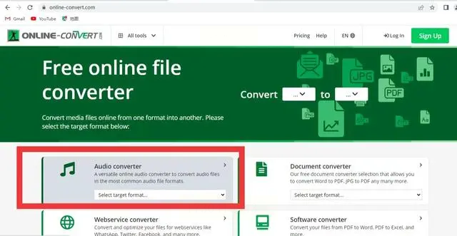 打开浏览器,搜索“Online-Convert”进入官网。首页上密密麻麻的功能选项可能会让你眼花缭乱,别担心,直接找到“Audio converter”这个选项点击进入。