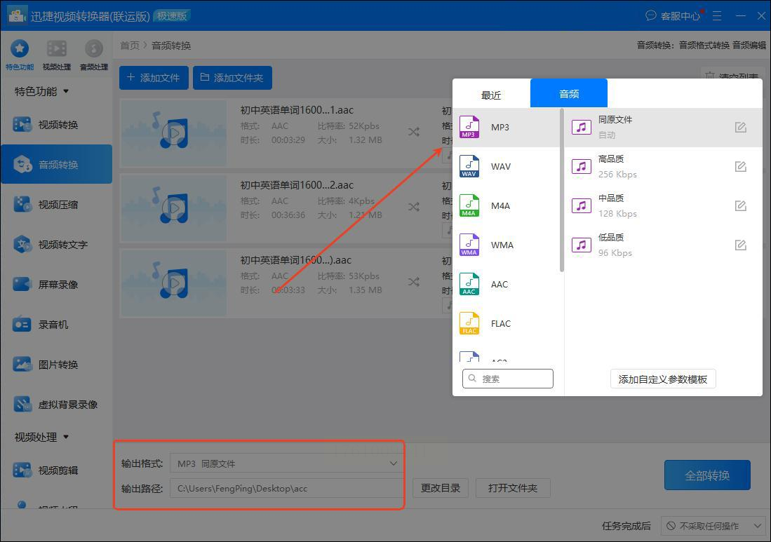 进入文件列表界面后,点击“输出格式”按钮,将格式设置为MP3。你也可以根据需求微调音频质量参数。