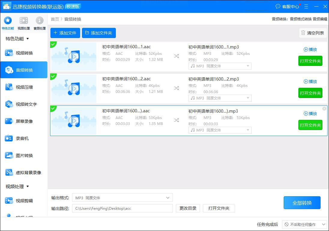 点击“全部转换”按钮,等待进度条走完。转换后的文件会自动保存到你事先设定的文件夹中。