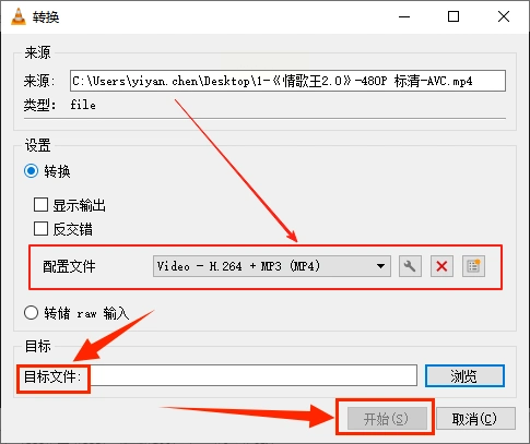 步骤三: 在下一个设置界面,找到“配置文件”或类似的下拉菜单,在里面选择“Audio – MP3”这个选项。接着,在下面设置好输出文件要保存的文件夹位置。最后,点击“开始”按钮,VLC就会进行转换了。