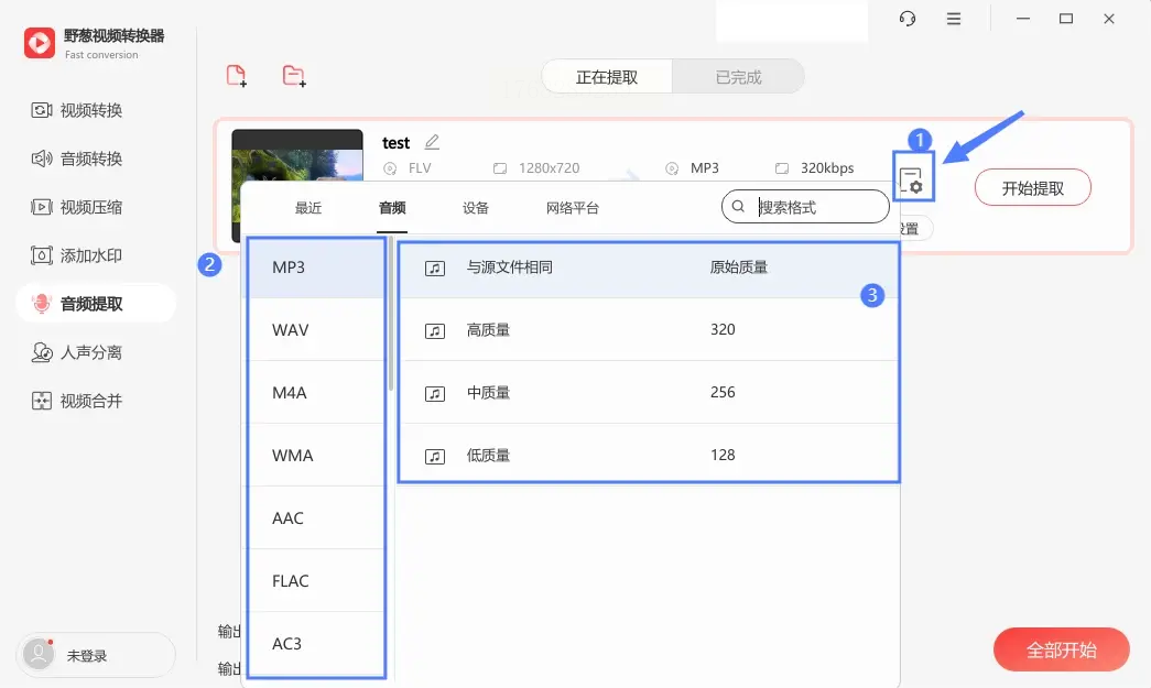 步骤三: 在输出设置那里,将格式选择为“MP3”。你通常可以调整一下比特率、采样率这些参数,来平衡一下音质和文件大小。最后,点击“开始转换”按钮,等它完成就行了。